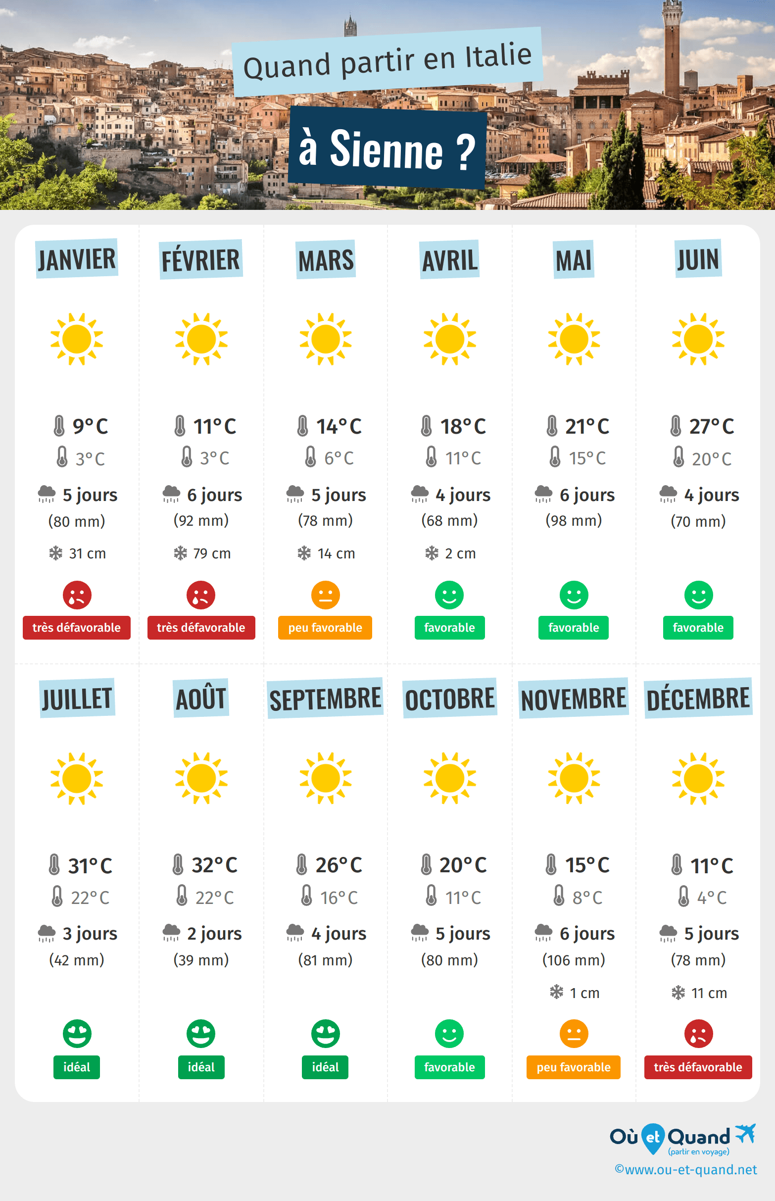 Pour obtenir toutes les informations sur le climat et la météo à Sienne d'un mois précis, cliquez sur le lien correspondant ci-dessous :