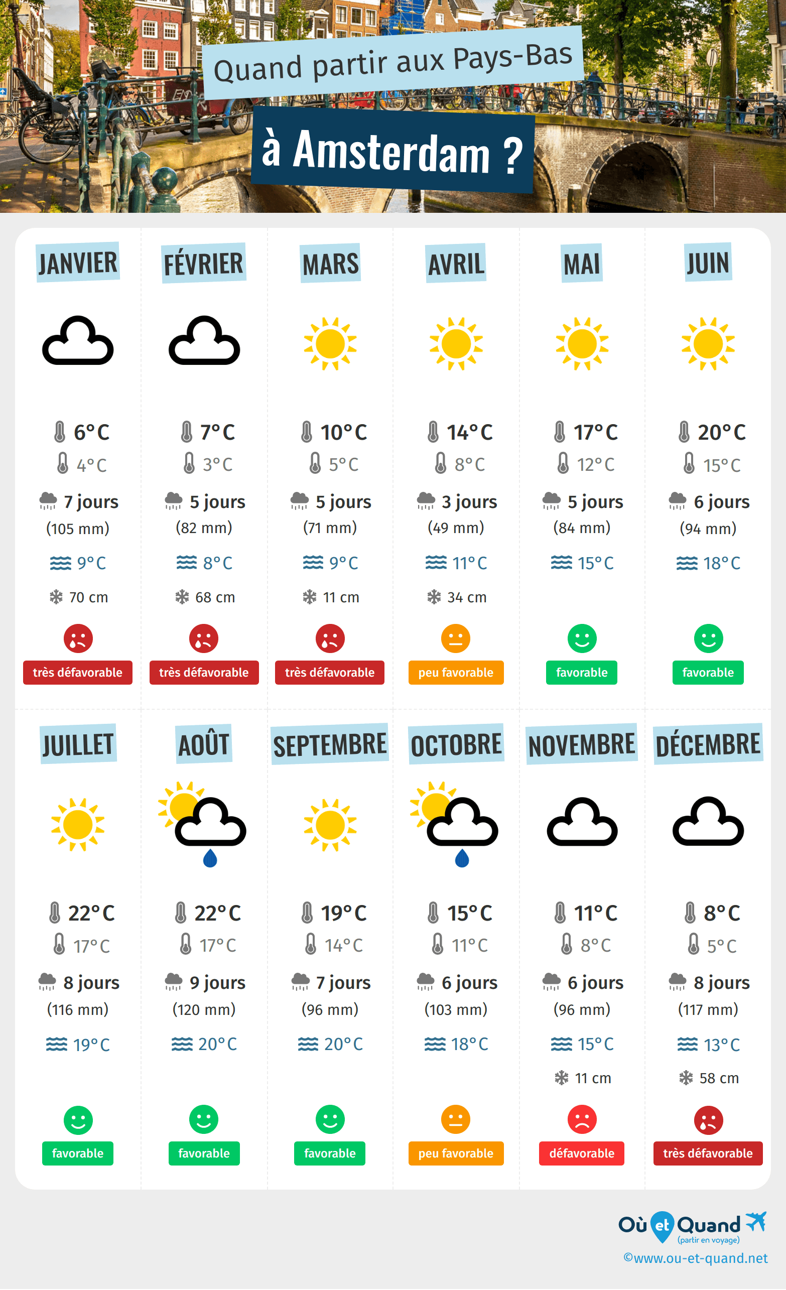 Quand partir à Amsterdam ? Voici quelques informations statistiques sur la météo à Amsterdam pour vous aider à trouver la meilleure période pour votre voyage :
