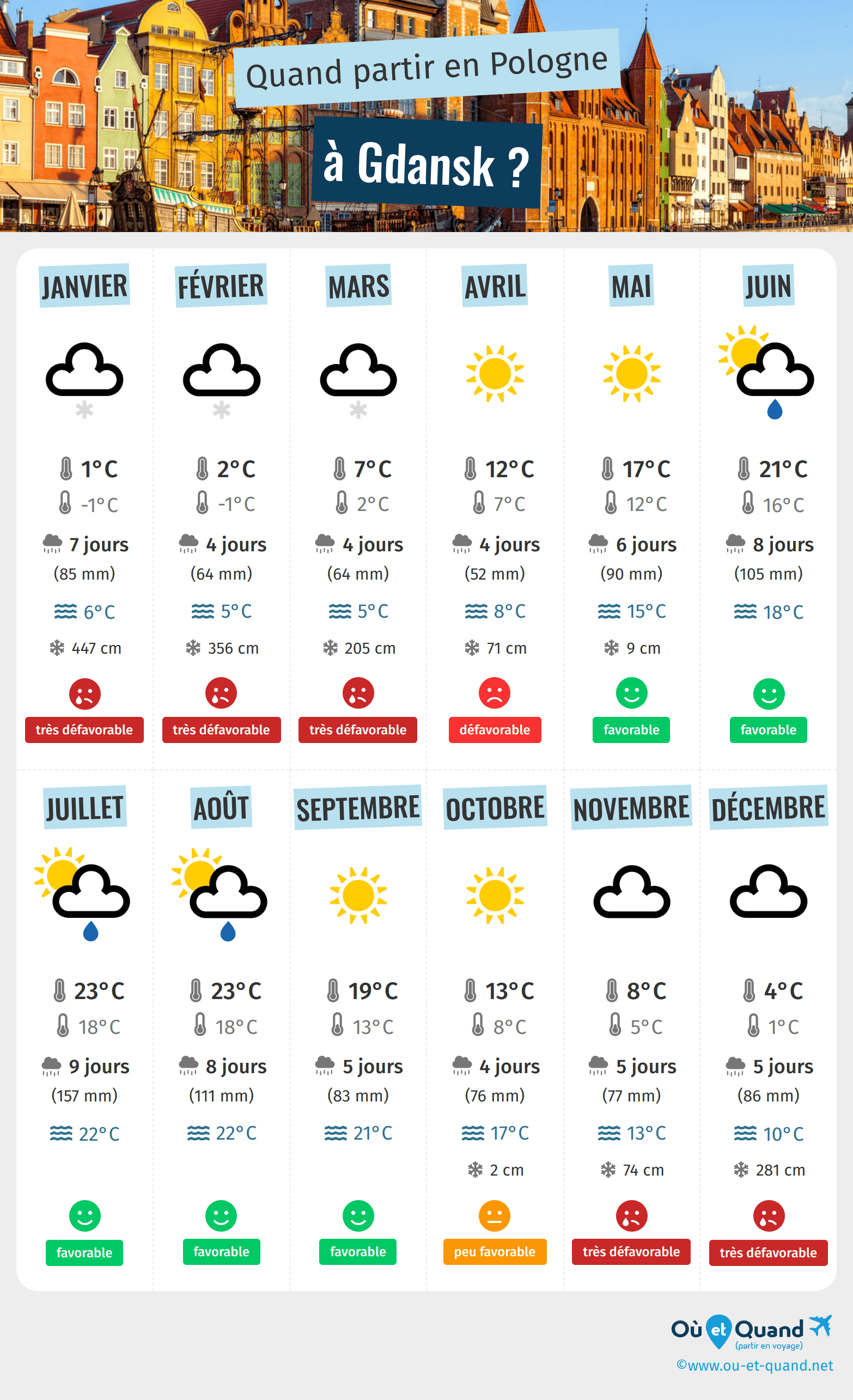 Quand partir à Gdansk ? Voici quelques informations statistiques sur la météo à Gdansk pour vous aider à trouver la meilleure période pour votre voyage :