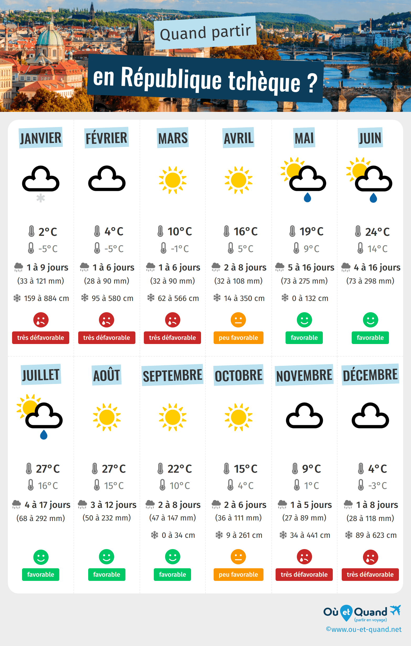 Climat, météo, saisons, fêtes et événements, affluence et saisons touristiques, évolution des prix mois par mois... Trouvez la meilleure période et la meilleure destination pour votre voyage en République tchèque !