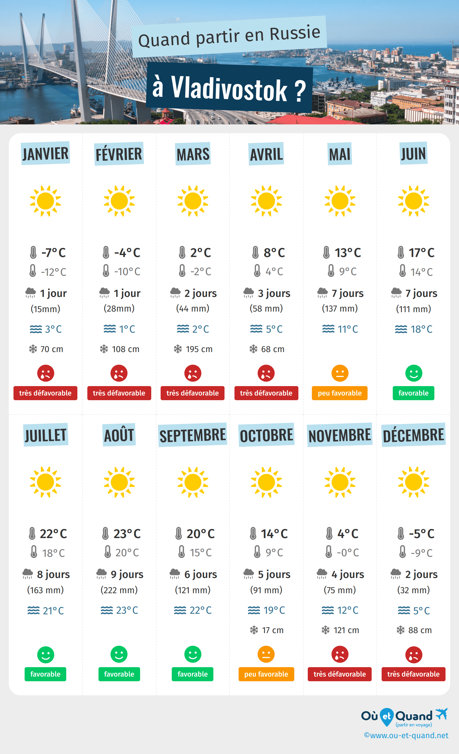 La température maximale à Vladivostok est en moyenne de 9°C sur l'année (de -7°C en janvier à 23°C en août). Il pleut 1090mm sur l'année, avec un minimum de 15mm en janvier et un maximum de 222mm en août. Le climat est correct pour partir en voyage à Vladivostok de Mai à Octobre, mais la météo est vraiment agréable de Juin à Septembre. Pour se baigner, la meilleure période pour une température de l'eau convenable est de Juillet à Septembre.