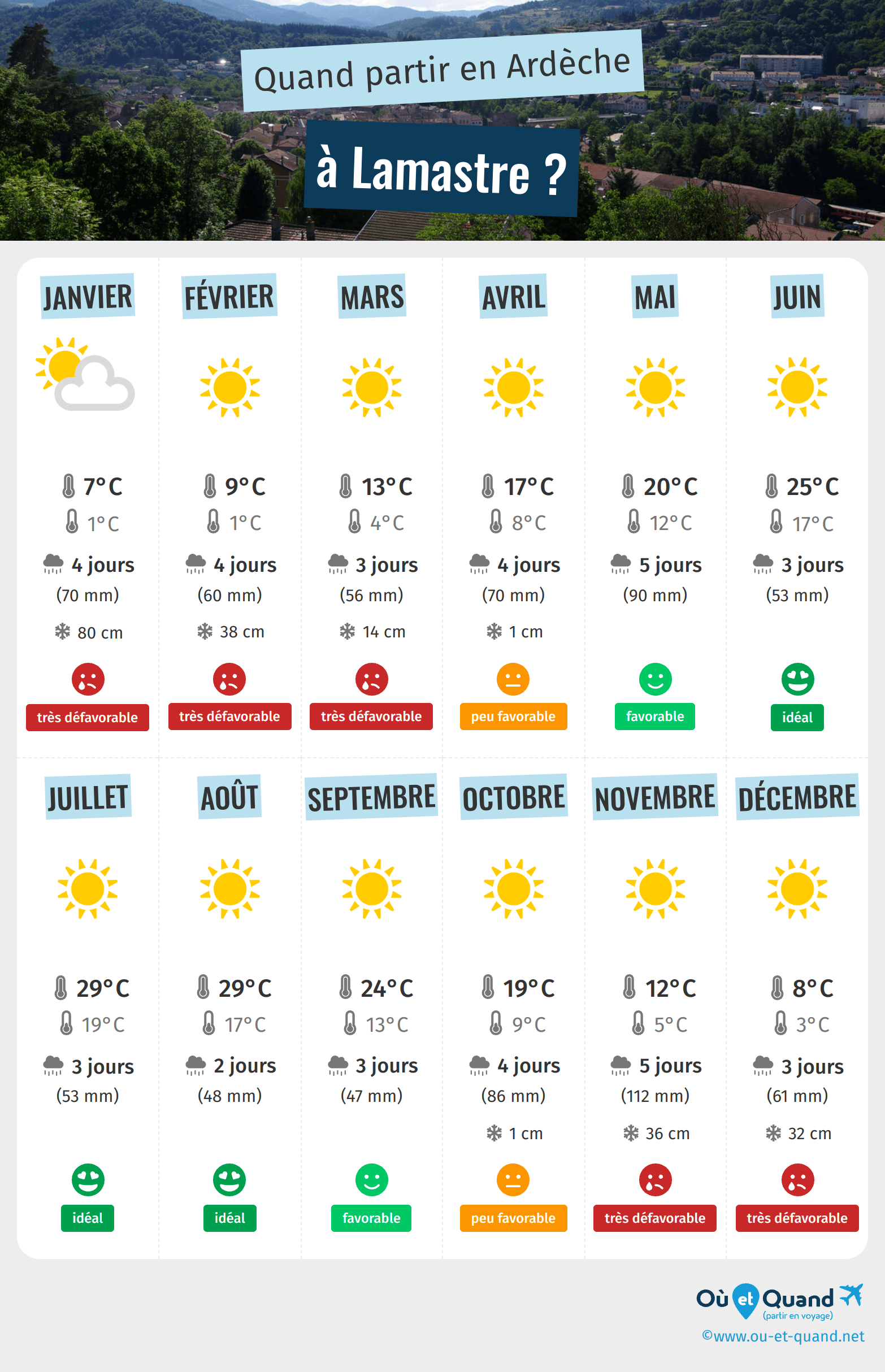 Pour obtenir toutes les informations sur le climat et la météo à Lamastre d'un mois précis, cliquez sur le lien correspondant ci-dessous :