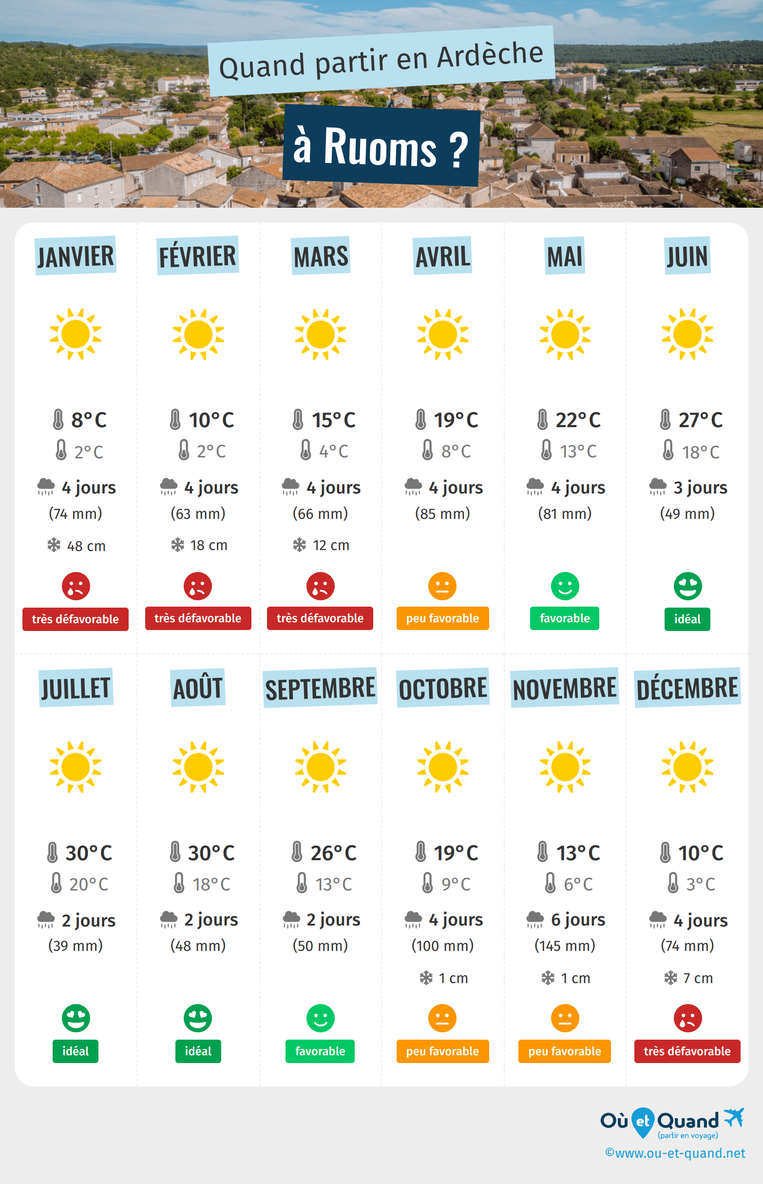 Pour obtenir toutes les informations sur le climat et la météo à Ruoms d'un mois précis, cliquez sur le lien correspondant ci-dessous :
