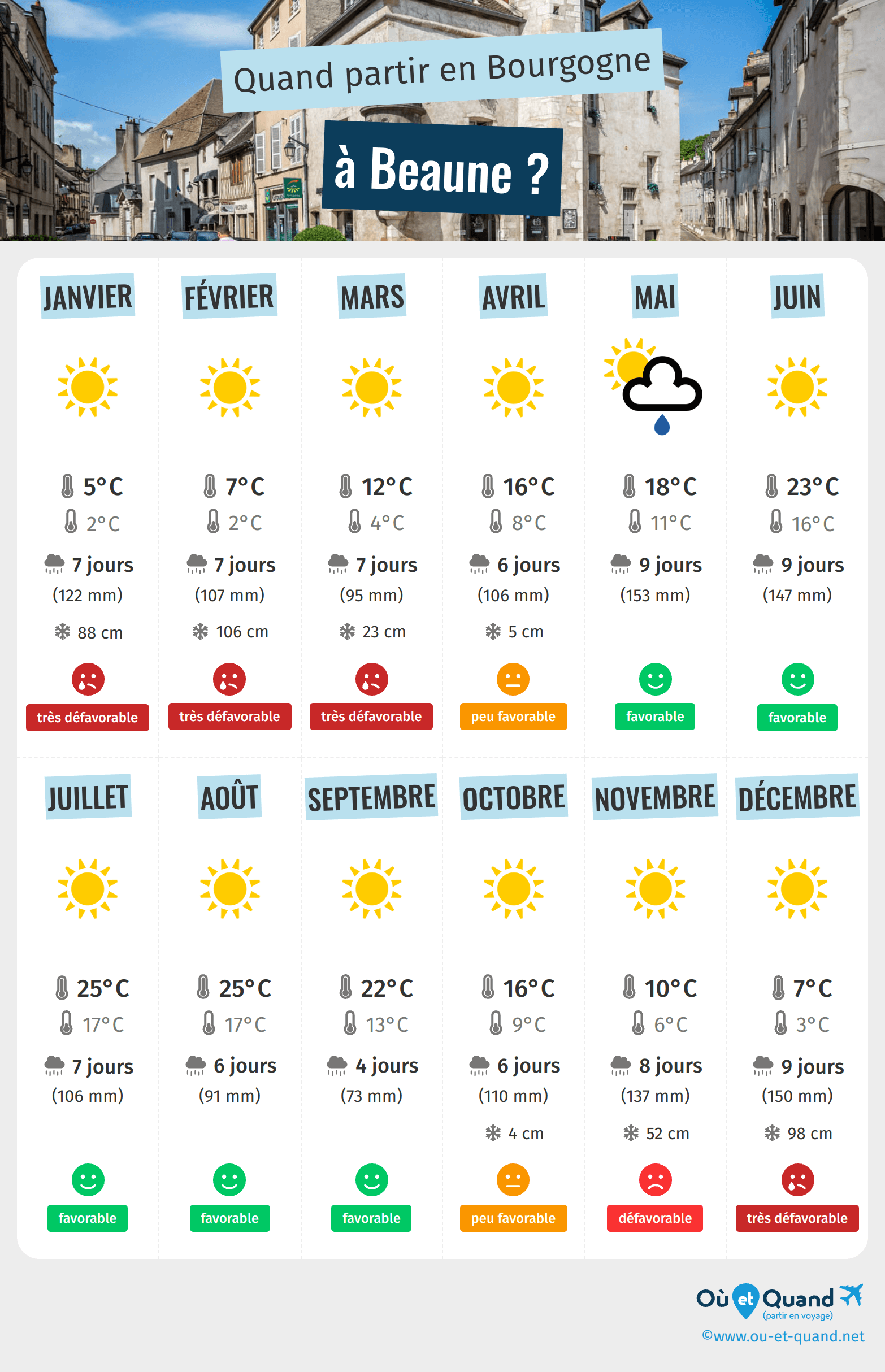 Pour obtenir toutes les informations sur le climat et la météo à Beaune d'un mois précis, cliquez sur le lien correspondant ci-dessous :