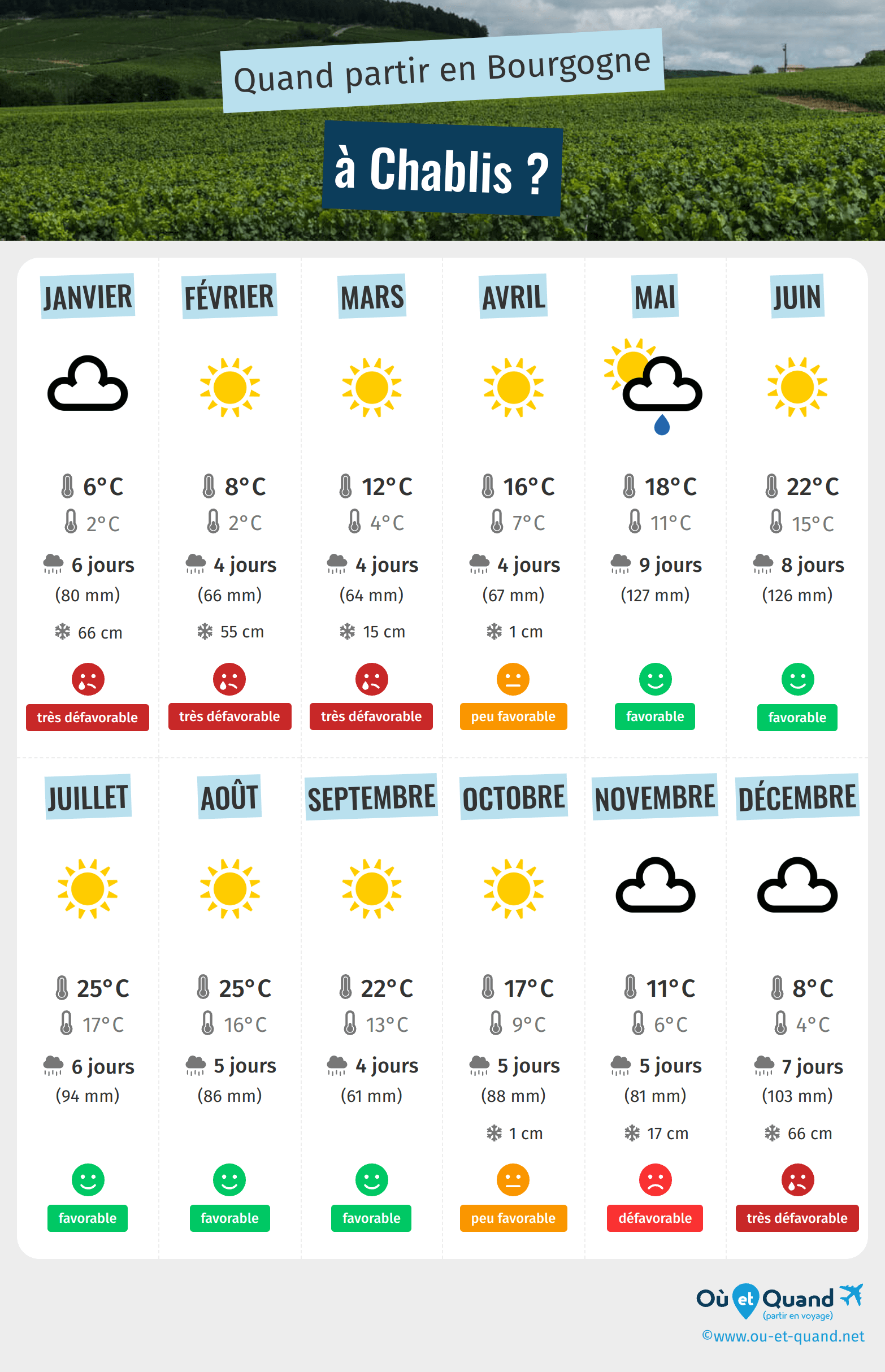 Pour obtenir toutes les informations sur le climat et la météo à Chablis d'un mois précis, cliquez sur le lien correspondant ci-dessous :