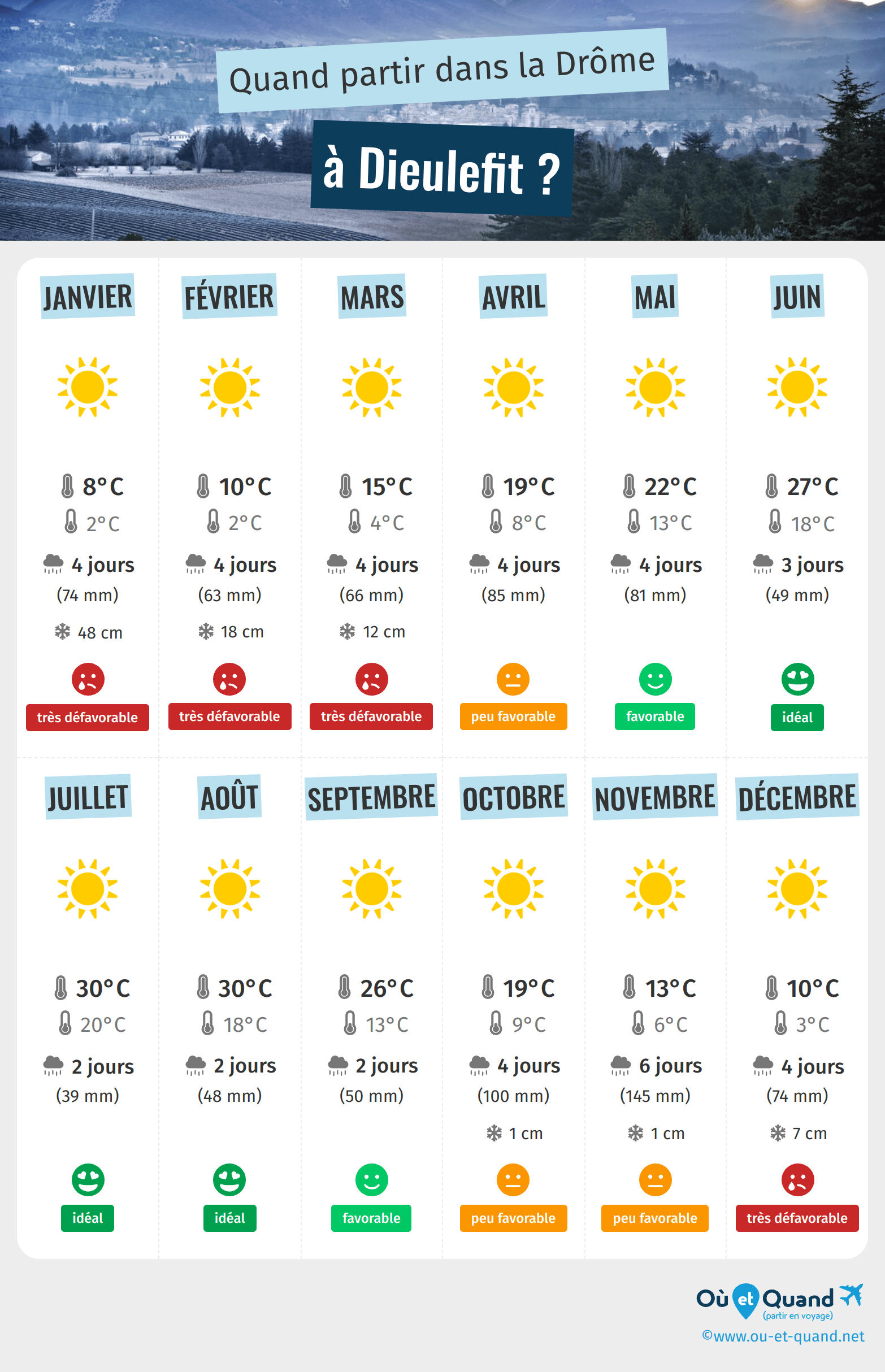 Pour obtenir toutes les informations sur le climat et la météo à Dieulefit d'un mois précis, cliquez sur le lien correspondant ci-dessous :