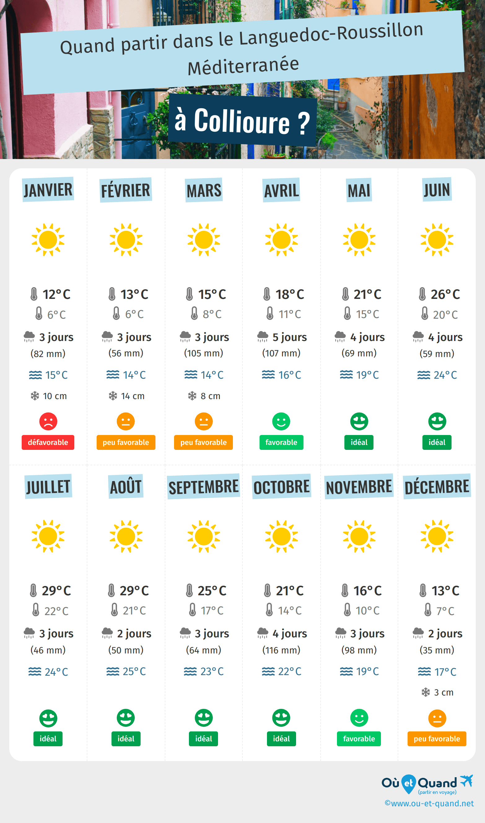 La température maximale à Collioure est en moyenne de 20°C sur l'année (de 12°C en janvier à 29°C en juillet). Il pleut 881mm sur l'année, avec un minimum de 35mm en décembre et un maximum de 116mm en octobre. Le climat est agréable pour partir en vacances à Collioure de Avril à Novembre, mais la météo est vraiment idéale de Mai à Octobre. Pour se baigner, la meilleure période pour une température de l'eau convenable est de Juin à Octobre.