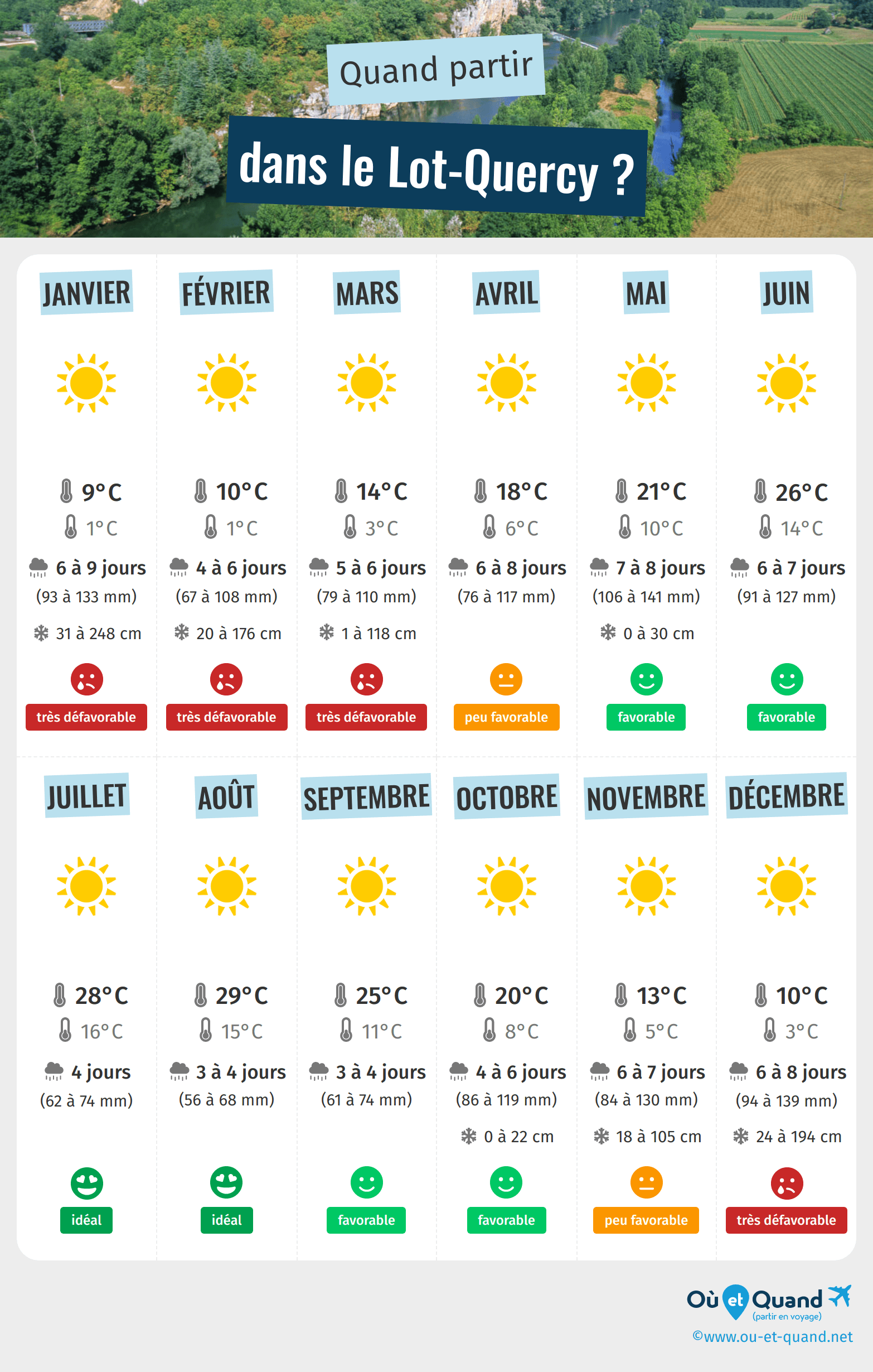 Climat, météo, saisons, fêtes et événements, affluence et saisons touristiques, évolution des prix mois par mois... Trouvez la meilleure période et la meilleure destination pour votre voyage dans le Lot - Quercy !