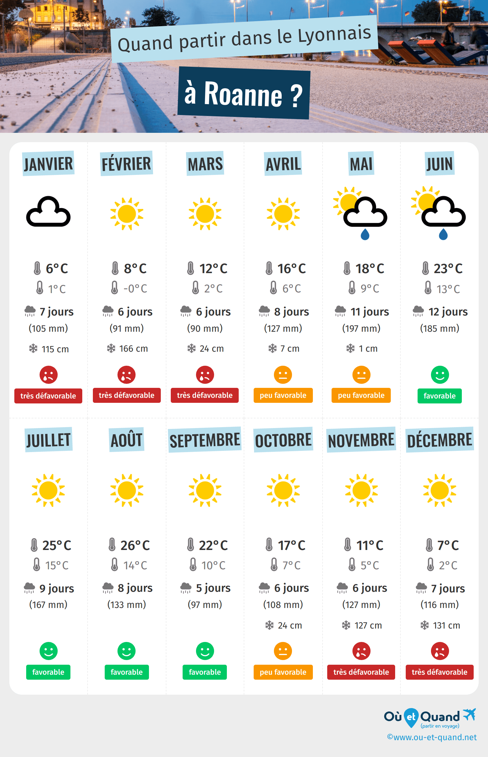 Quand partir à Roanne ? Voici quelques informations statistiques sur la météo à Roanne pour vous aider à trouver la meilleure période pour votre voyage :