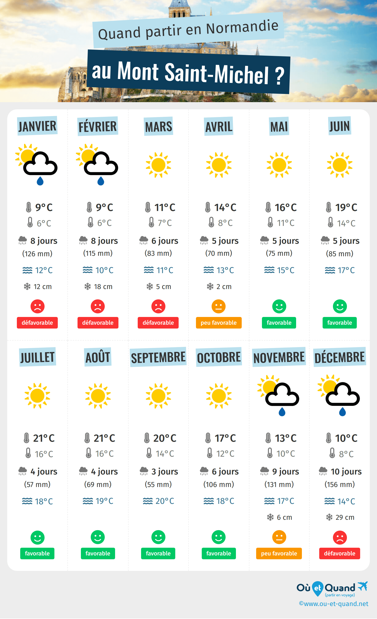 Quand partir au Mont Saint-Michel ? Voici quelques informations statistiques sur la météo au Mont Saint-Michel pour vous aider à trouver la meilleure période pour votre voyage :