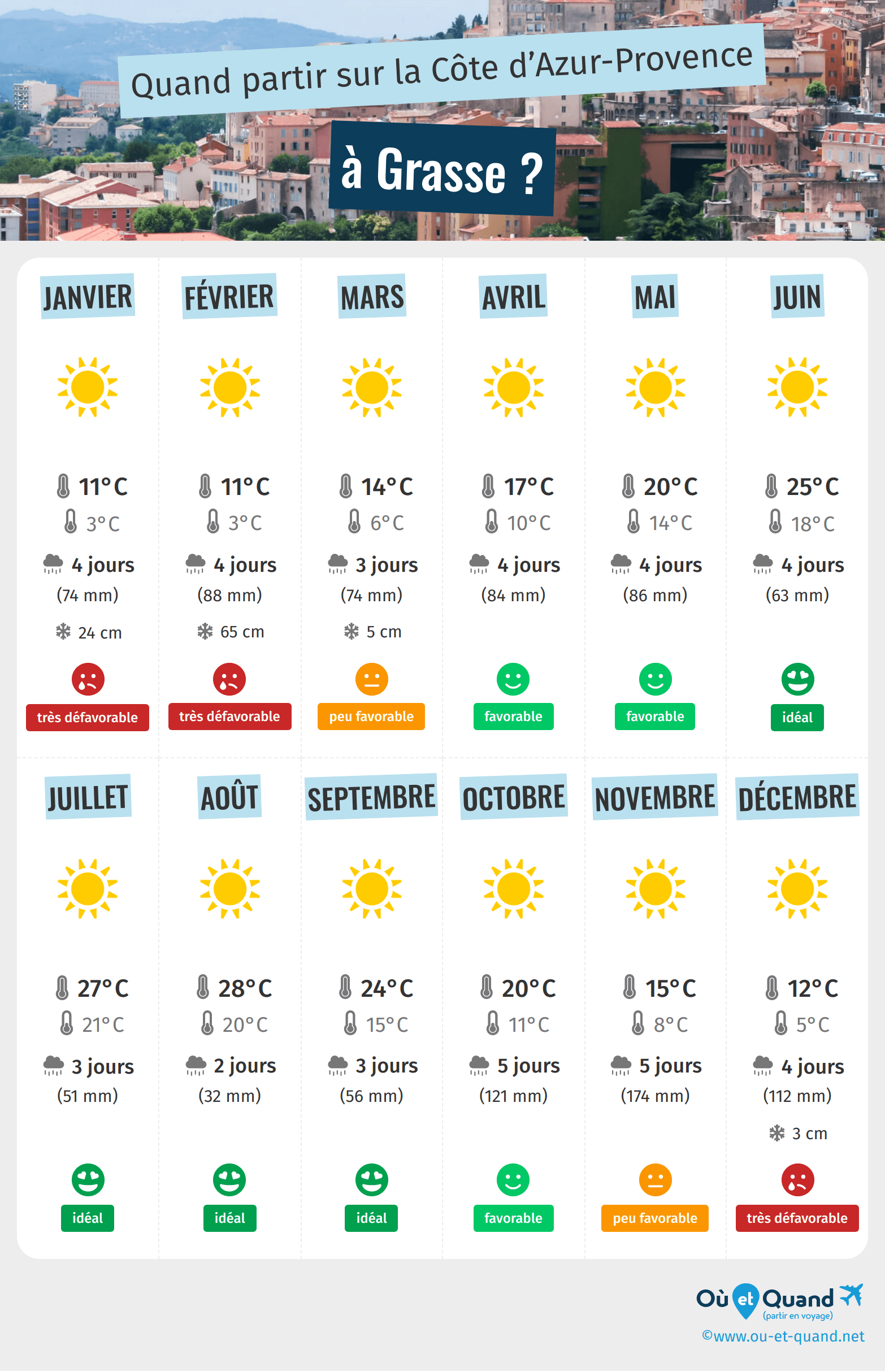 La température maximale à Grasse est en moyenne de 19°C sur l'année (de 11°C en janvier à 28°C en août). Il pleut 1009mm sur l'année, avec un minimum de 32mm en août et un maximum de 174mm en novembre. Le climat est agréable pour partir en vacances à Grasse de Avril à Octobre, mais la météo est vraiment idéale de Juin à Septembre.