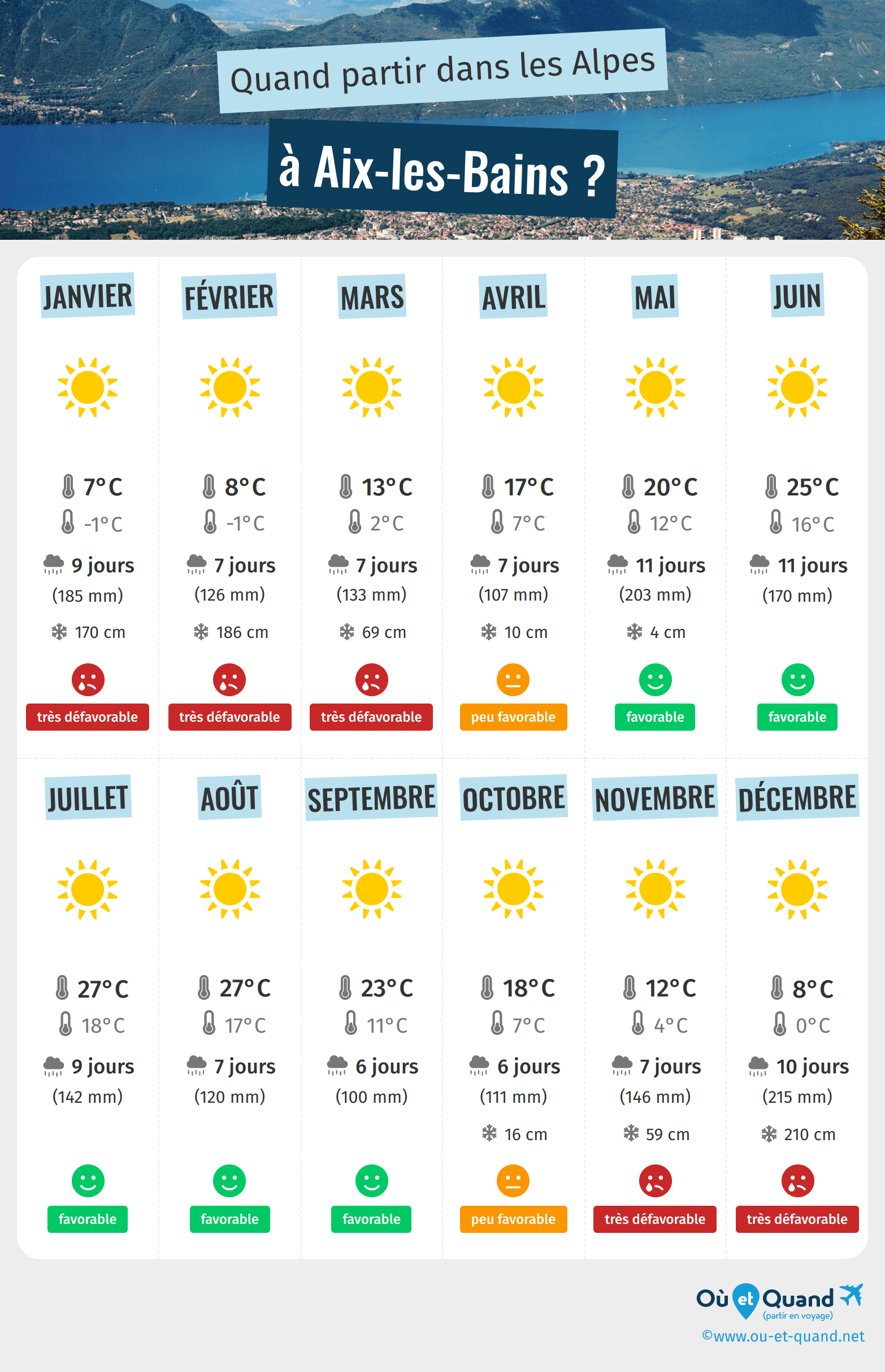 Pour obtenir toutes les informations sur le climat et la météo à Aix-les-Bains d'un mois précis, cliquez sur le lien correspondant ci-dessous :