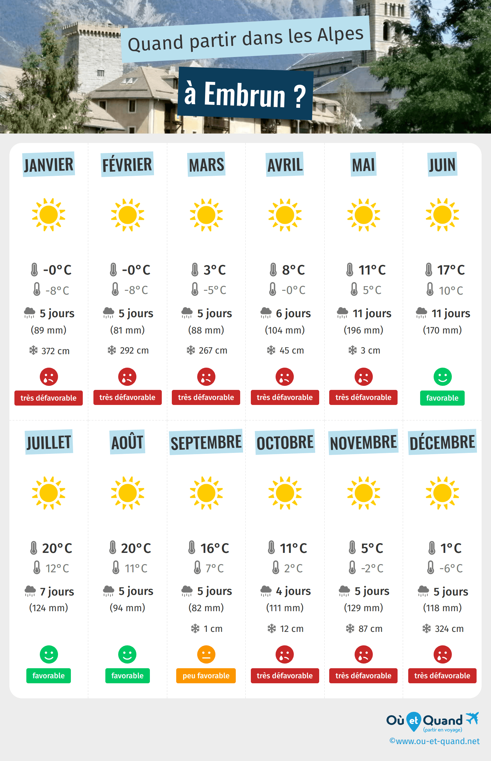 Pour obtenir toutes les informations sur le climat et la météo à Embrun d'un mois précis, cliquez sur le lien correspondant ci-dessous :