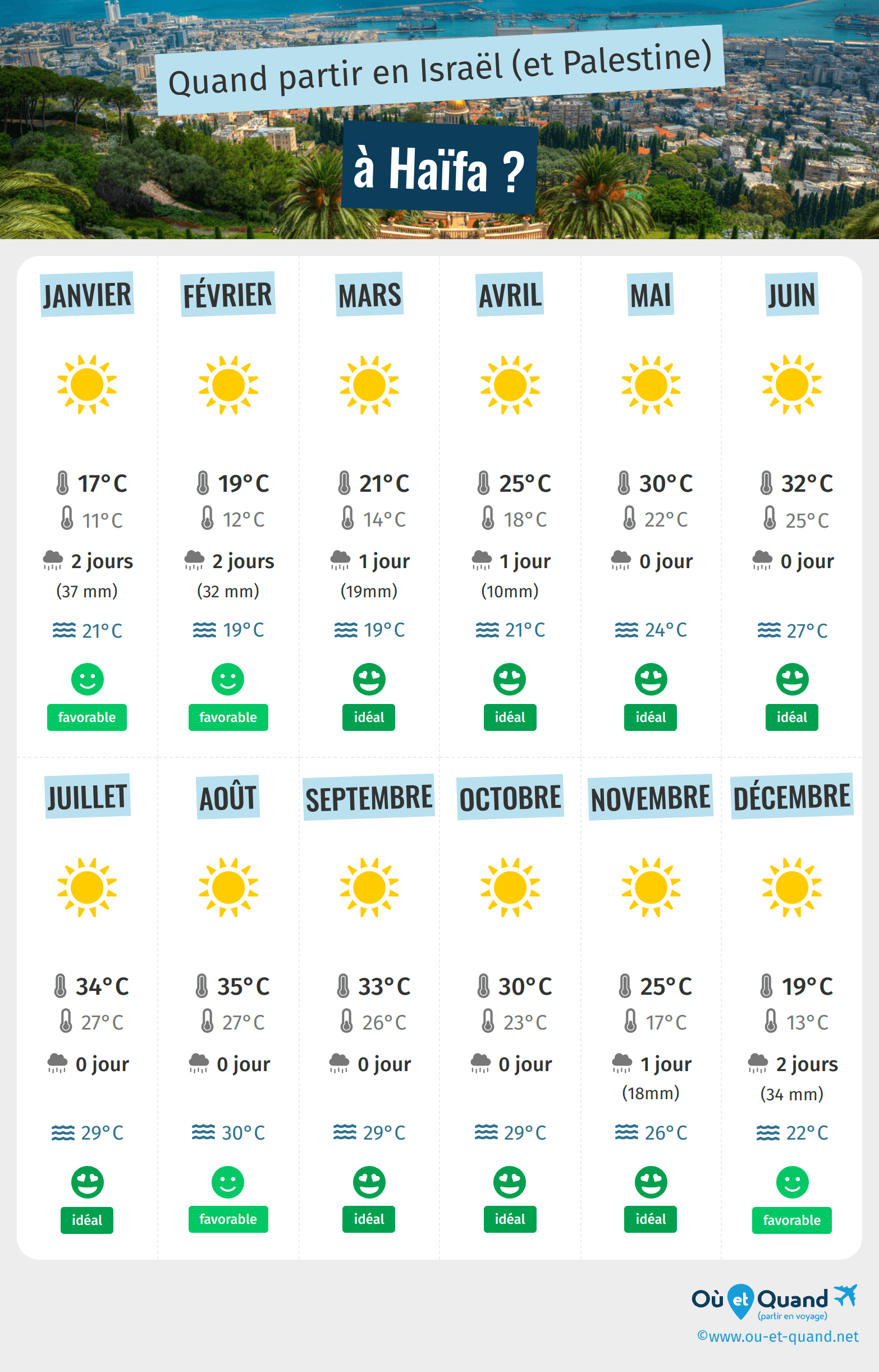 La température maximale à Haïfa est en moyenne de 27°C sur l'année (de 17°C en janvier à 35°C en août). Il pleut 162mm sur l'année, avec un minimum de 1mm en août et un maximum de 37mm en janvier. Le climat est agréable pour partir en voyage à Haïfa toute l'année, mais la météo est vraiment idéale de Mars à Juillet et de Septembre à Novembre. Pour se baigner, la meilleure période pour une température de l'eau convenable est de Juillet à Octobre.
