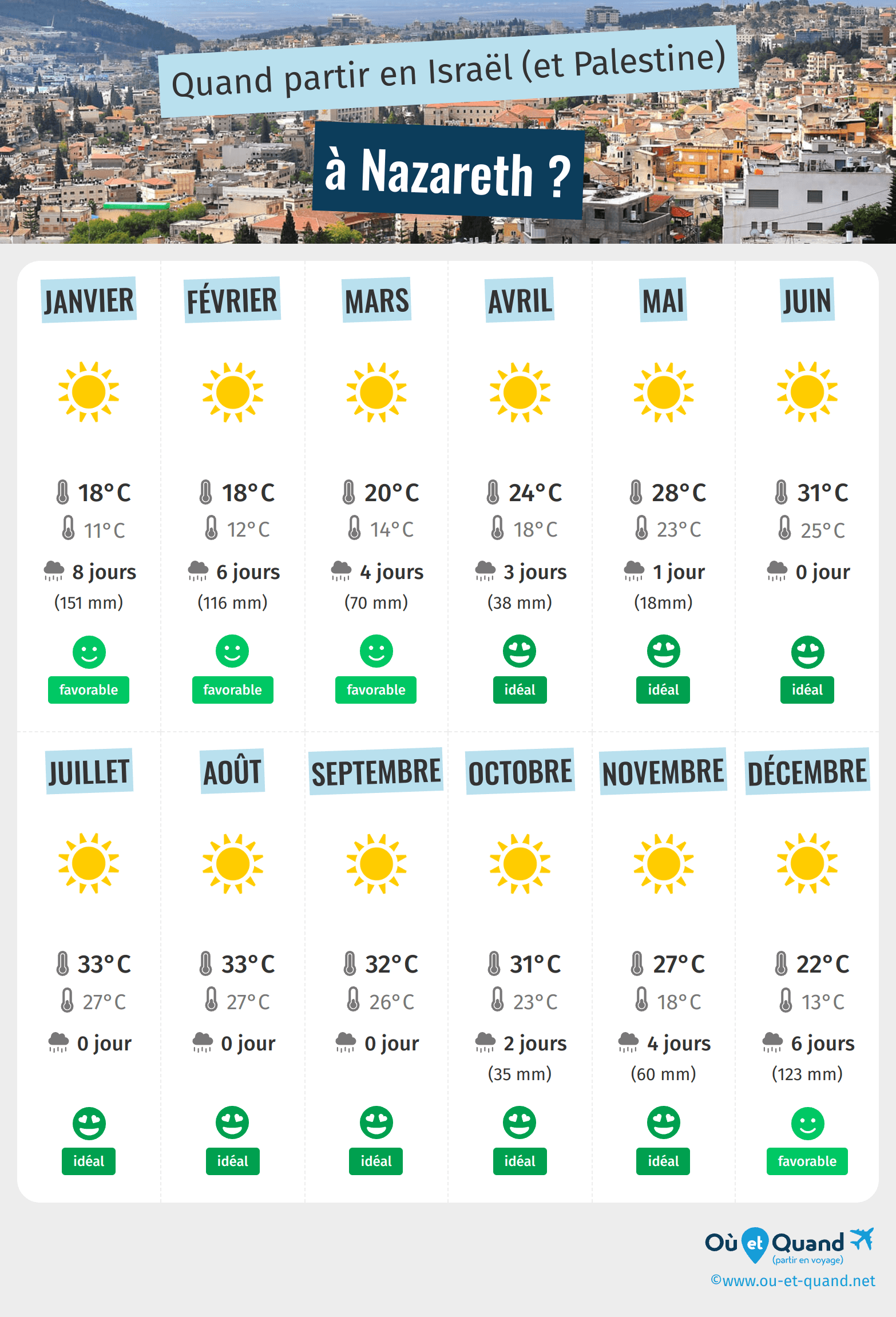 Pour obtenir toutes les informations sur le climat et la météo à Nazareth d'un mois précis, cliquez sur le lien correspondant ci-dessous :