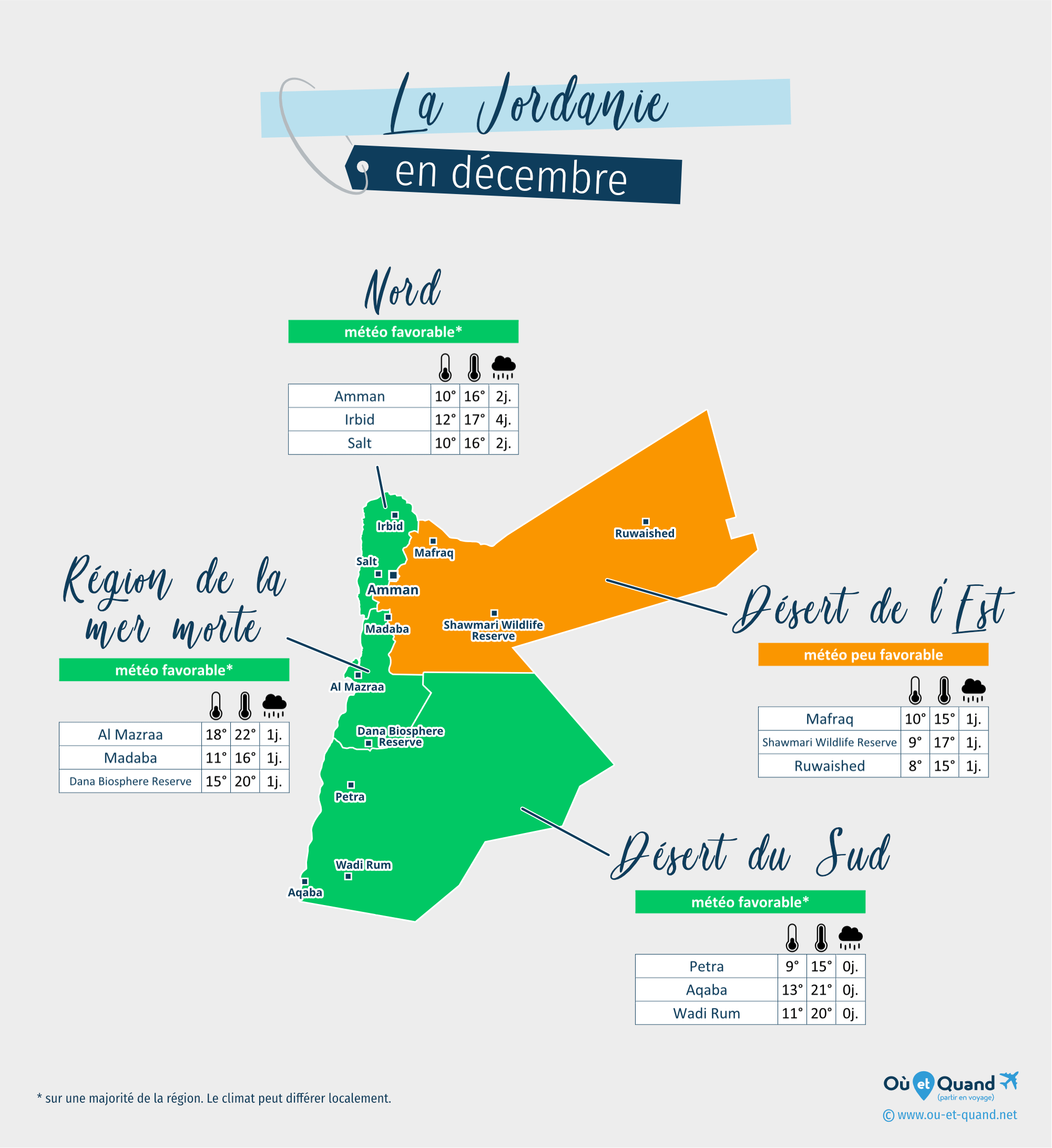 Le mois de décembre coïncide avec l'hiver. et même si les températures sont relativement douces, la fraîcheur se fait tout de même ressentir, notamment dans la matinée. Mais de par leur situation géographique, les localités d'Amman et la cité antique de Petra sont défavorisées par un climat en décembre en Jordanie, plutôt dominé par la fraicheur. Quand au reste du territoire, le port de vêtements chauds suffit à vous faire ressentir une sensation agréable.