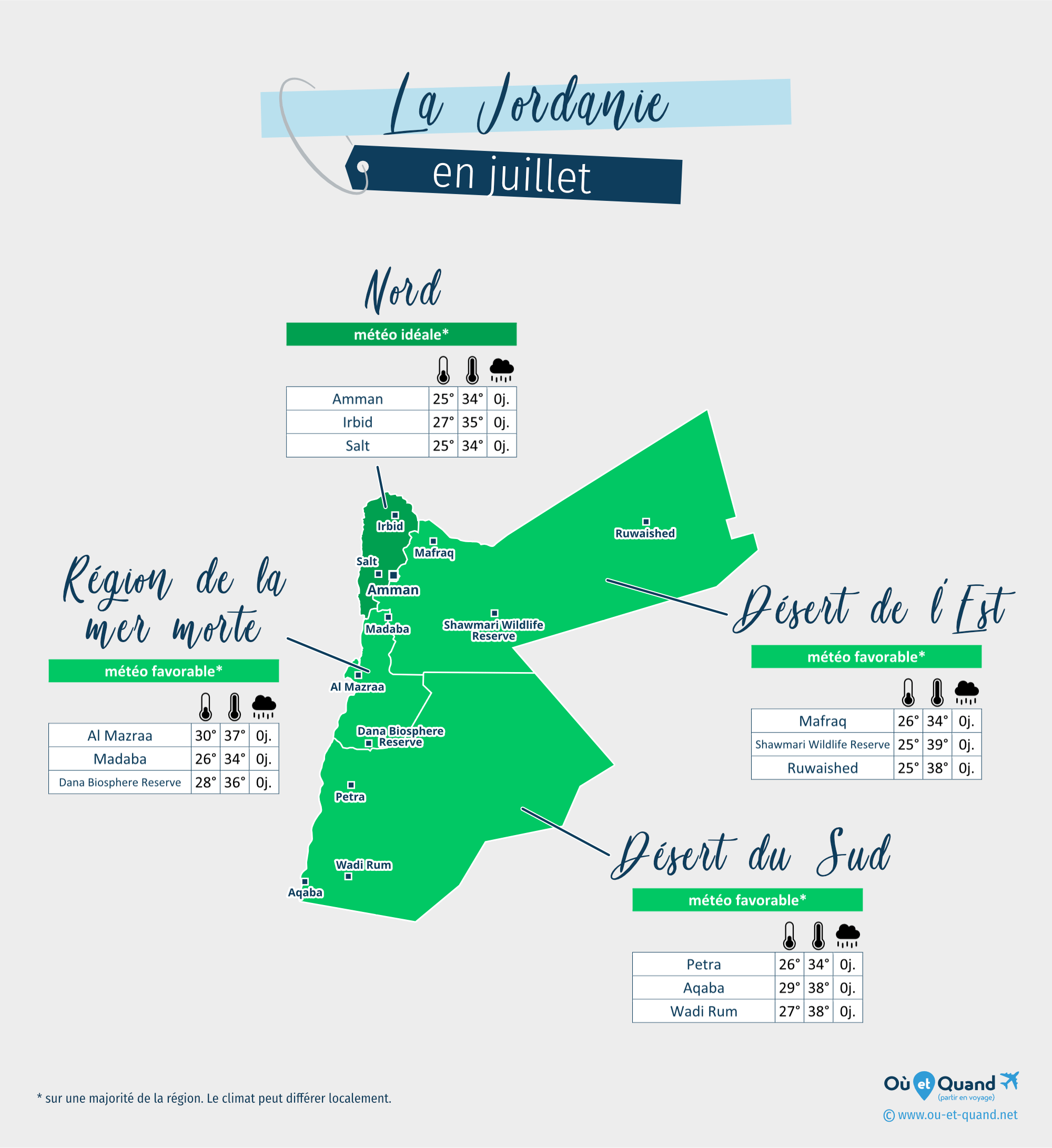 Découvrez sur la carte ci-dessous où aller en Jordanie pour visiter cette destination au mois de juillet avec les meilleures conditions climatiques.