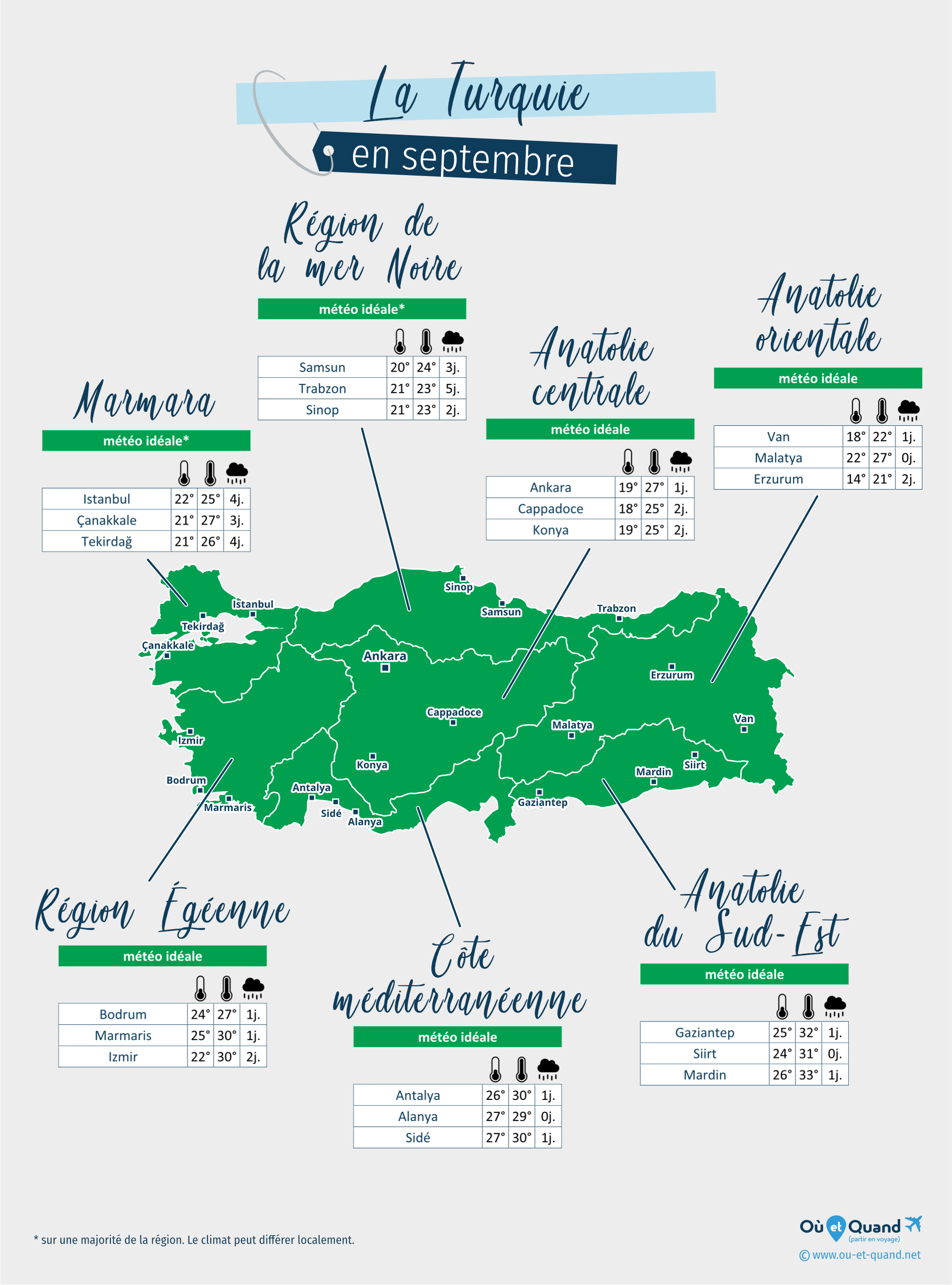 Utilisez les onglets ci-dessous pour découvrir la météo en septembre dans chaque zone de la Turquie et consulter les normales saisonnières des principales villes.