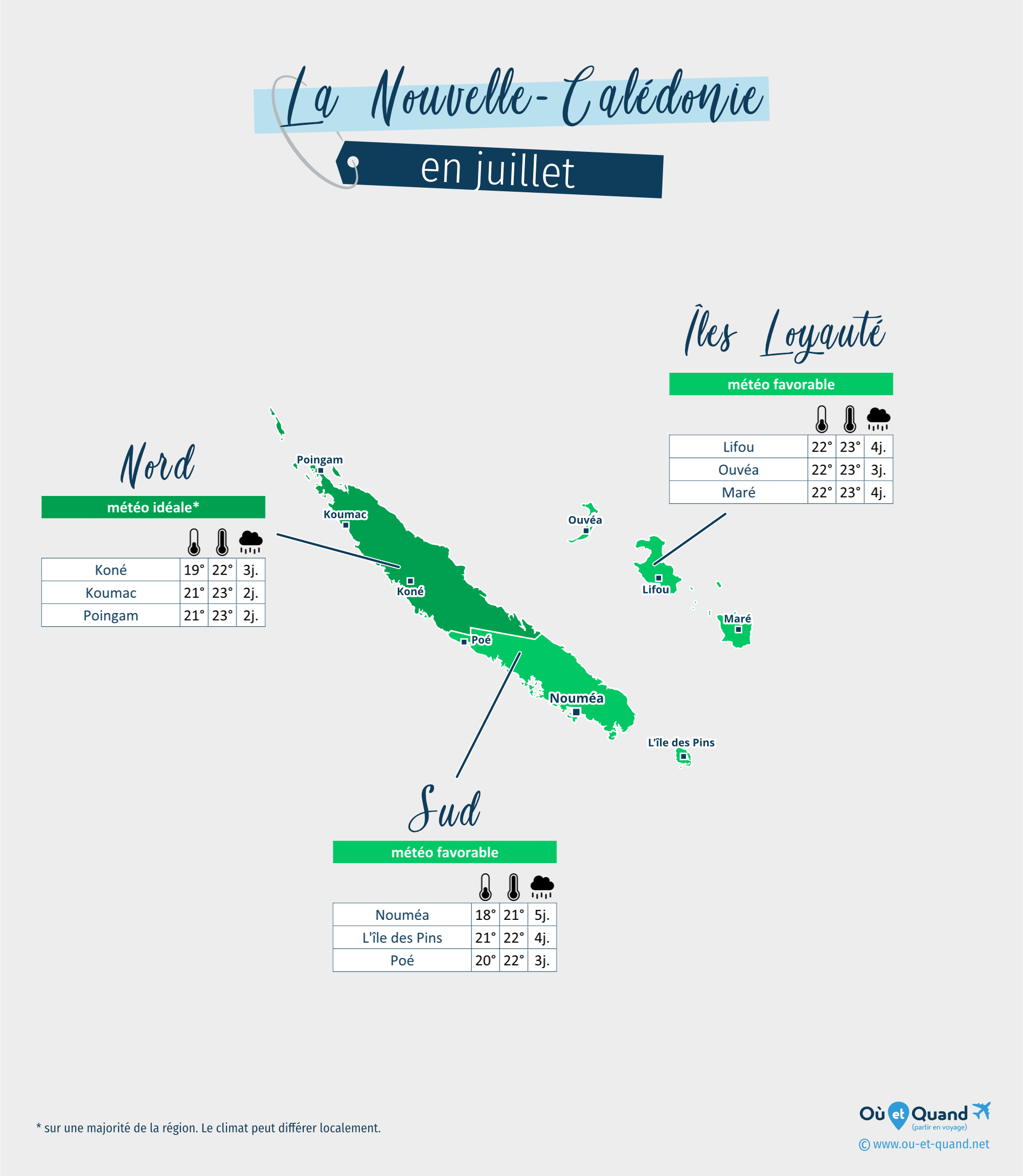 Découvrez sur la carte ci-dessous où aller en Nouvelle-Calédonie pour visiter cette destination au mois de juillet avec les meilleures conditions climatiques.