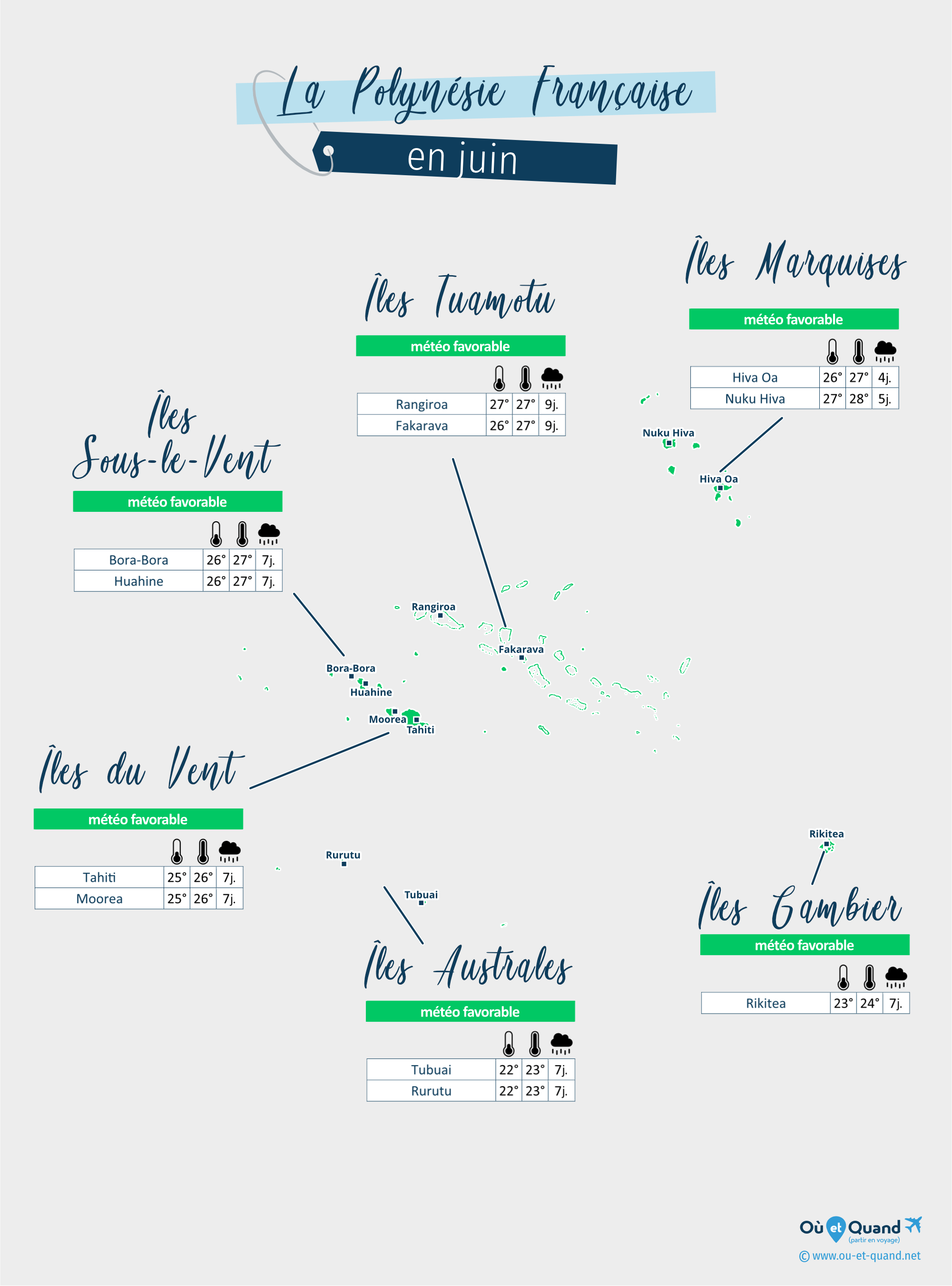| Îles Australes en juin (Tubuai, Rurutu, Raivavae...) | 24°C | 7 jours | 25°C | favorable |