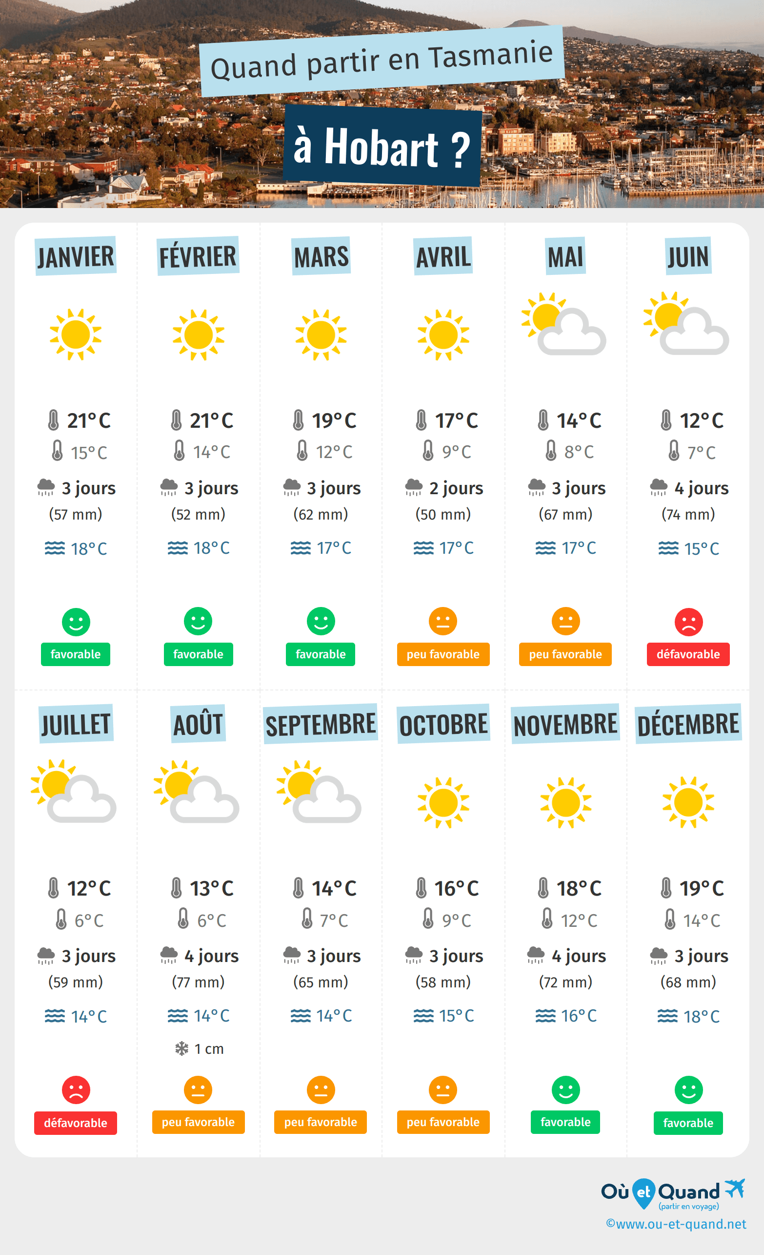 Quand partir à Hobart ? Voici quelques informations statistiques sur la météo à Hobart pour vous aider à trouver la meilleure période pour votre voyage :