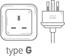 - Type G : 3 broches, dont une broche avec terre (Ampérage : 13 A, Voltage : 220 – 240 V)