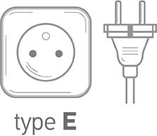 - Type E : 2 broches, avec la terre en prise femelle (Ampérage : 16 A, Voltage : 220 – 240 V)