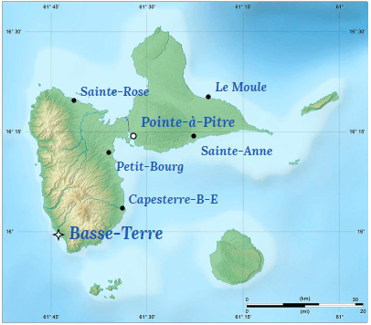 Territoire situé dans les Antilles, la Guadeloupe se trouve à moins de 600 kilomètres du Venezuela et à plus de 6000 de Paris ! Archipel baigné par la mer des Caraïbes, la Guadeloupe, constituée de plusieurs îlets, se trouve entre le tropique du Cancer et l'Equateur. Les deux principales îles habitées son Grande-Terre et Basse-Terre.
